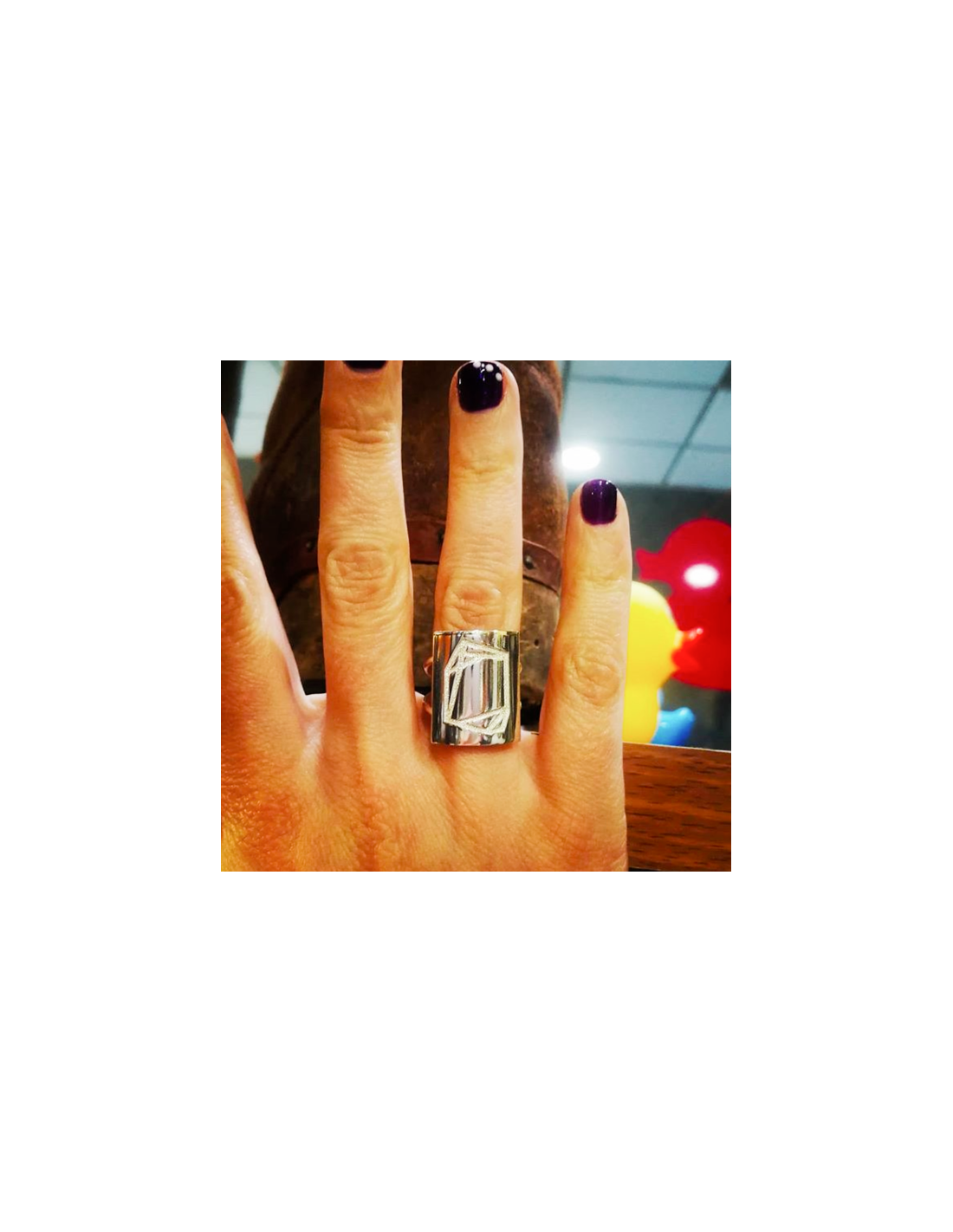 Un anillo de cuerpo doble (dos aros unidos en el centro) y una parte central rectangular de 20 mm de largo y 17 mm de ancho con el diamante tallado.