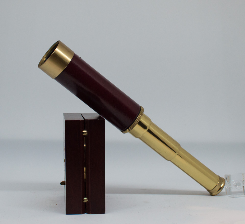 Catalejo monocular, formado por tres tubos de latón y detalle en polipiel