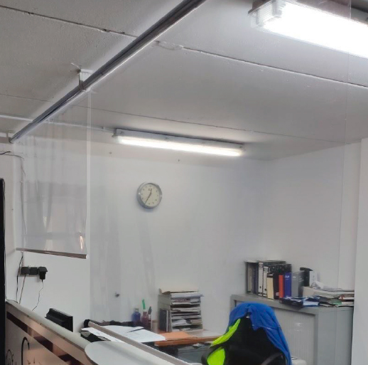 Cortina de protección a medida. Enrollable, transparente, fabricada en PVC, que evitando la contaminación, permite mantener el contacto visual entre trabajador y cliente de forma segura. Fácil de limpiar, con una solución jabonosa. Su instalación es muy sencilla.