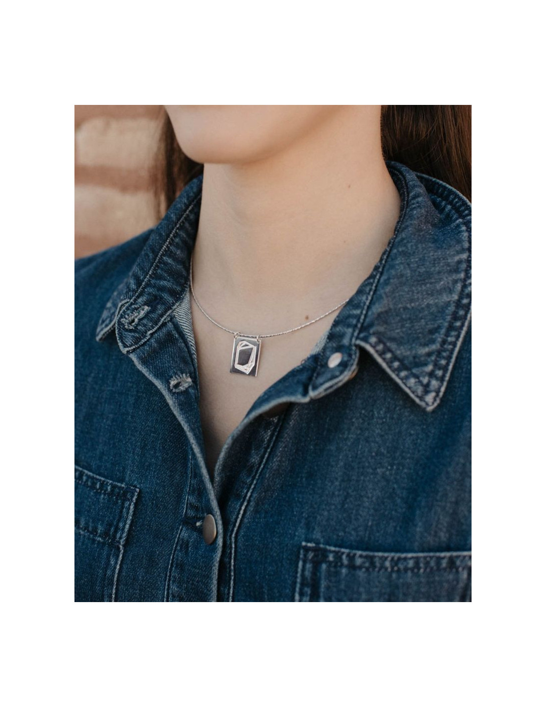 La gargantilla de plata sostenible Silvia rompe moldes y por eso es tan atractiva. La medalla es cuadrada y lleva grabada un diamante en bruto con una forma muy especial.