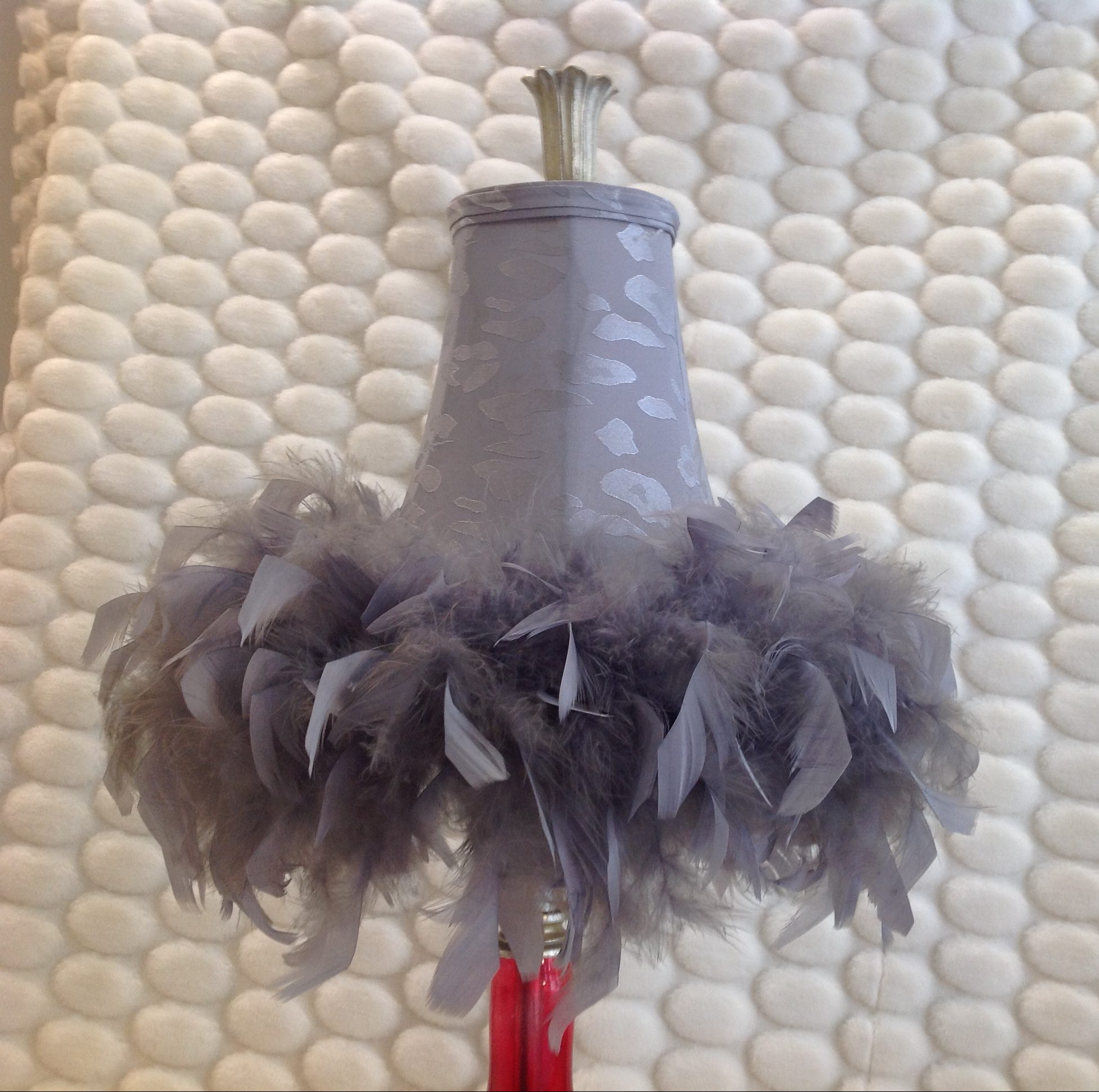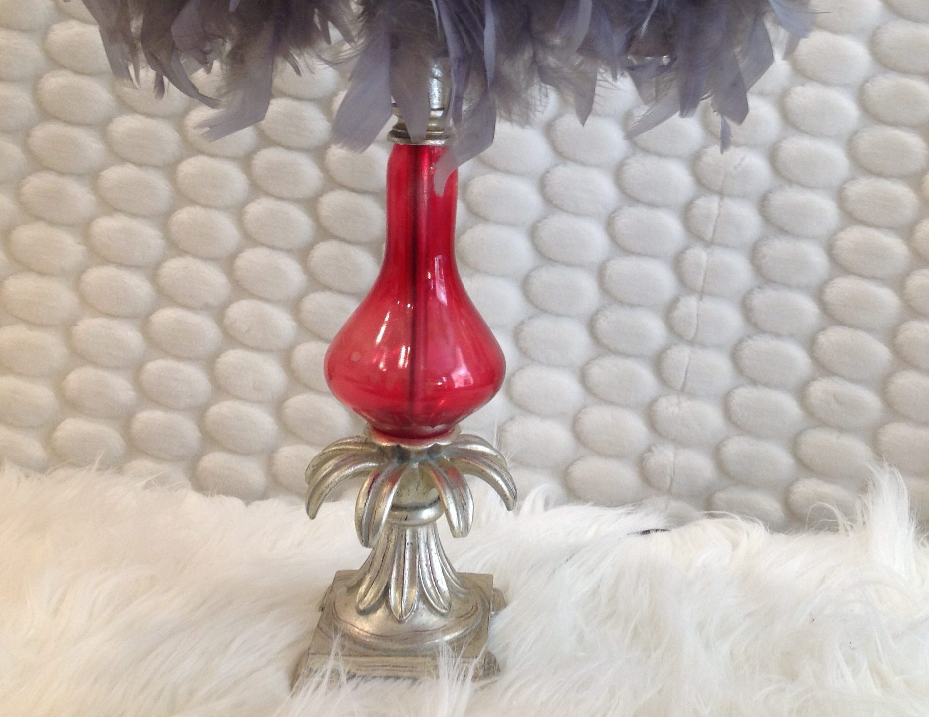 Lámpara de sobremesa, pie de cristal tintado en tono morado con base de madera con talla vegetal acabado en pan de plata y tulipa de seda en color gris con plumas naturales.