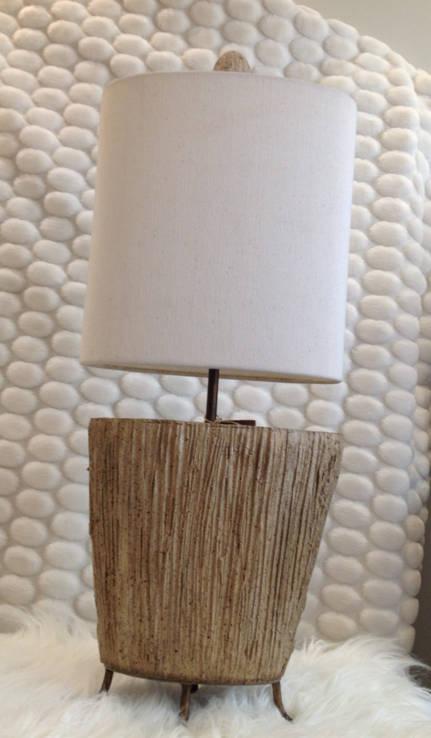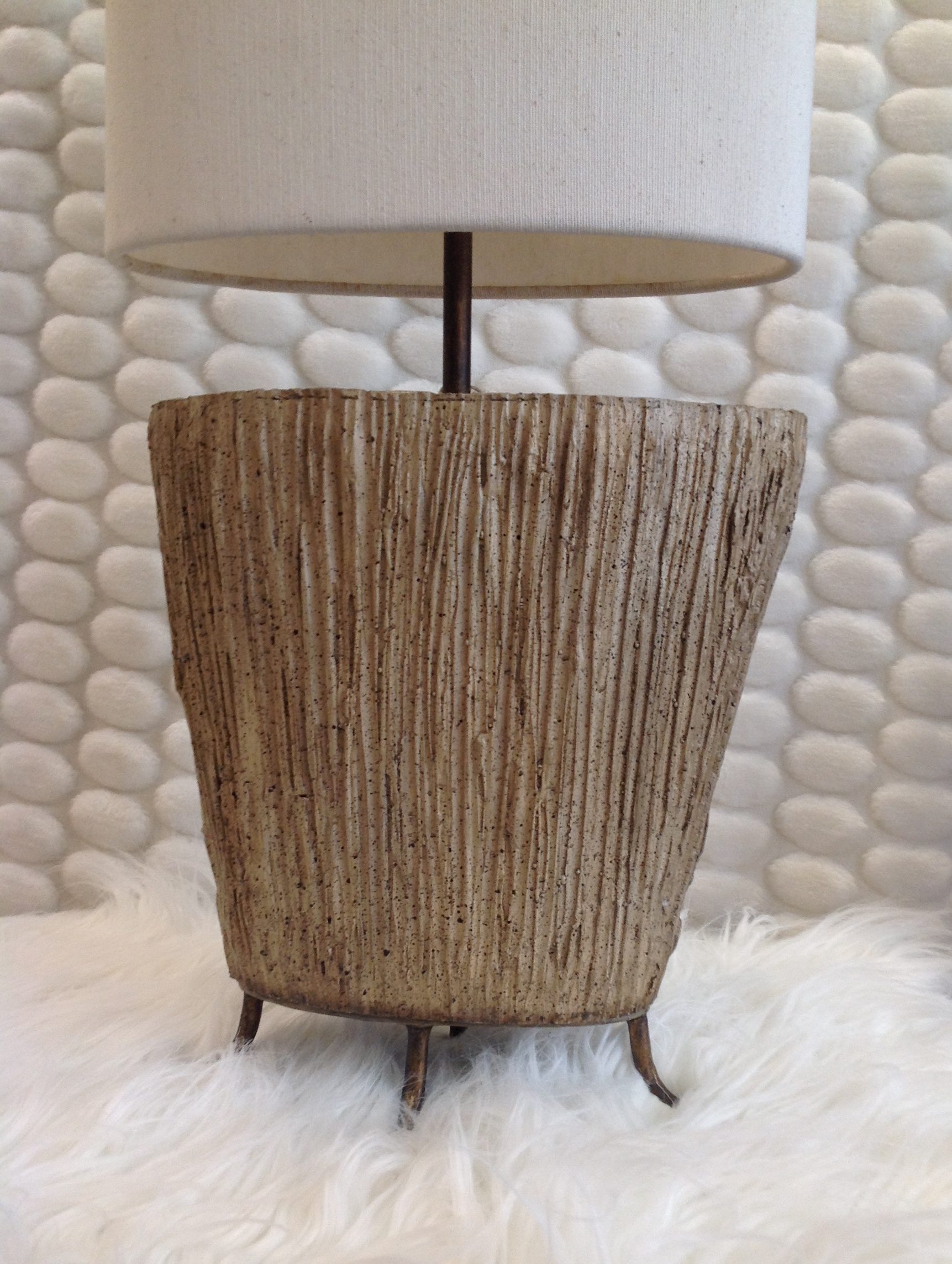 Lámpara de sobremesa, base en resina pintada a mano con patita metálica en oro viejo y tulipa de algodón en color lino
