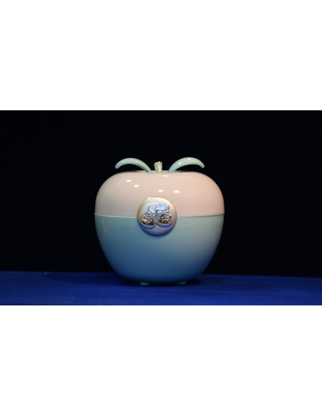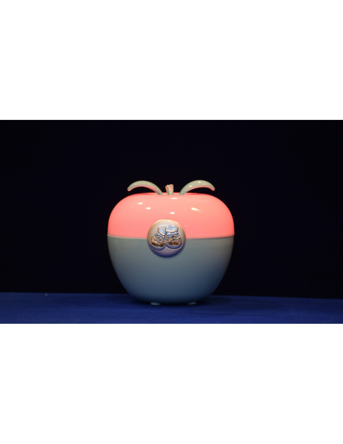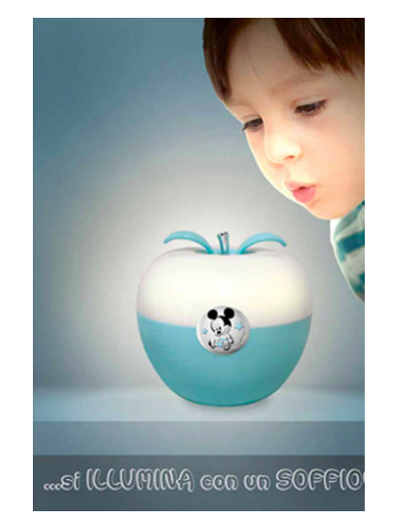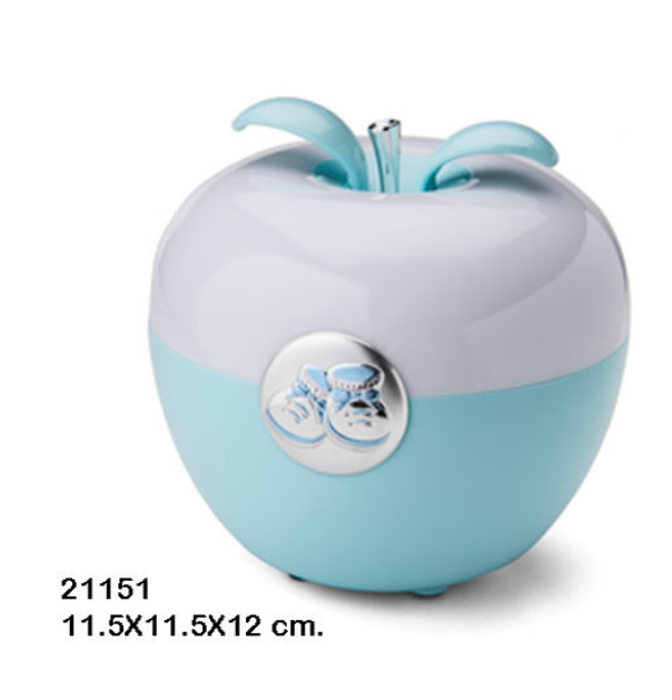 Bonita luz nocturna con forma de manzana y detalle en plata con relieve de patucos. La luz va cambiando de color para hacer más agradable la hora del sueño a los niñ@s.