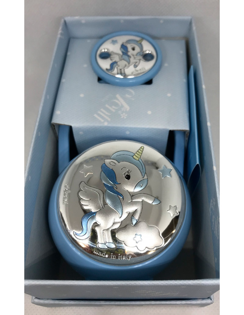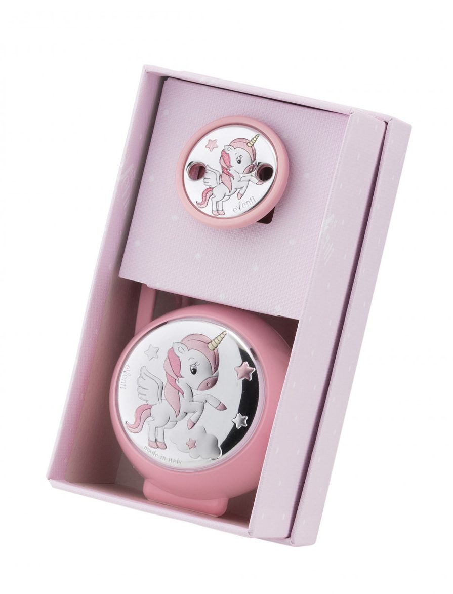Portachupetes y chupetero rosa con detalle de unicornio en plata y esmaltado. Cómodo para colgar en la silla y llevarlo siempre a mano. Además, los unicornios están de máxima actualidad, por lo que acertarás seguro.Encantará a las niñas y a las mamás.