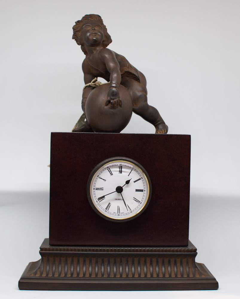 Reloj de alabastro estilo Art Deco con querubín acabado en cuero envejecido